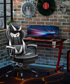 Computer Gaming Chair, Racing Desk Chair with Lumbar Support and Footrest, PU Leather Gamer Chair with Headrest and Swivel Wheels for Home, White