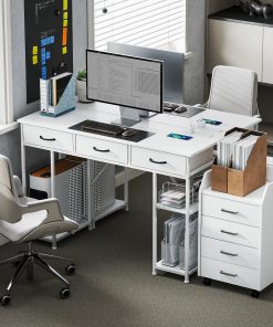 Tidy up your workspace with the computer desk, where convenience meets style! Stay charged and ready with the built-in charging station, equipped with two power outlets and two USB ports. Plus, this bedroom desk offers lots of storage with three fabric drawers and four versatile shelves, ensuring everything from books to stationery is neatly organised. Need extra space for your PC tower? Just remove a shelf! Transform and energise your work area effortlessly!