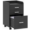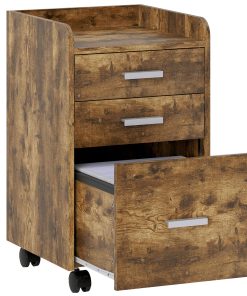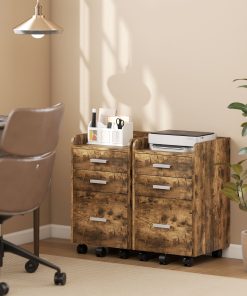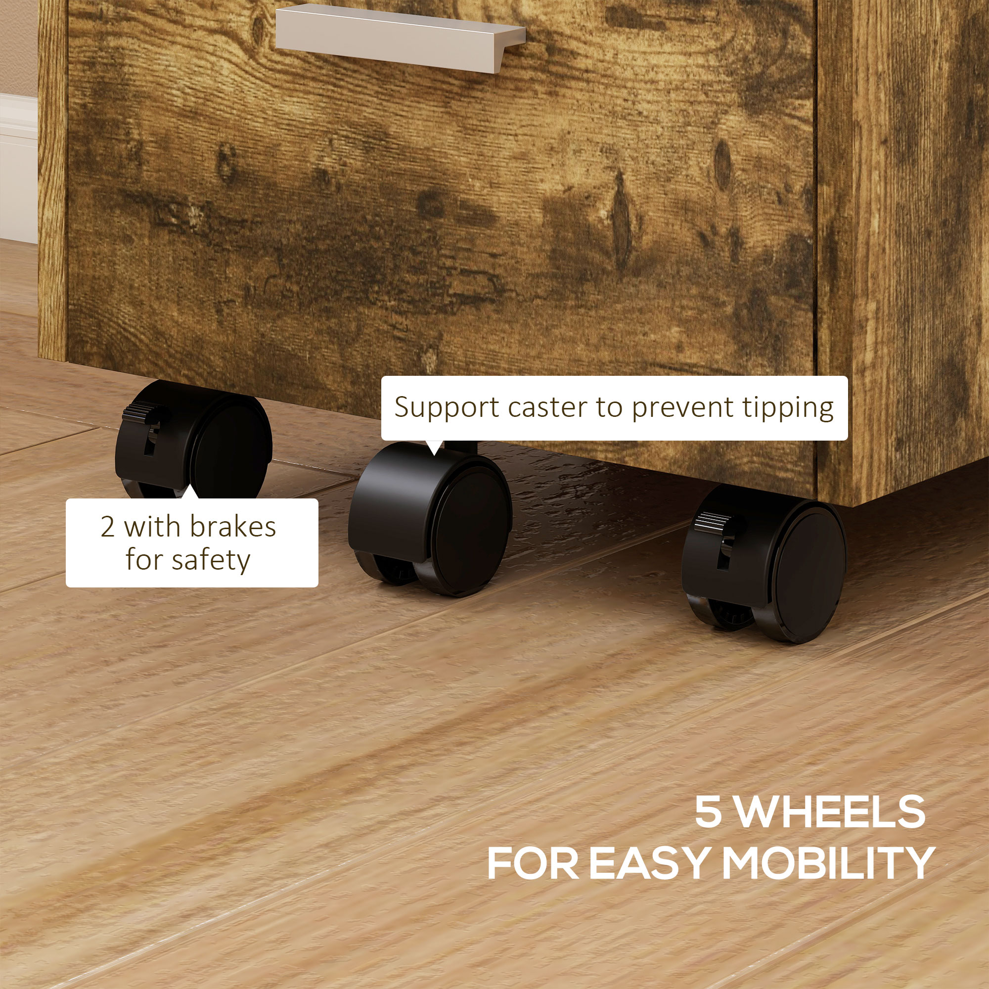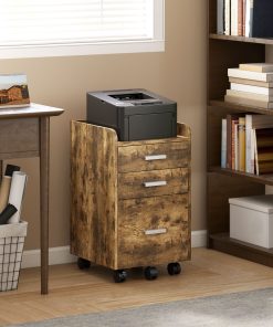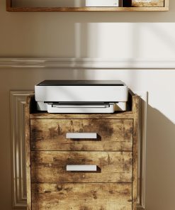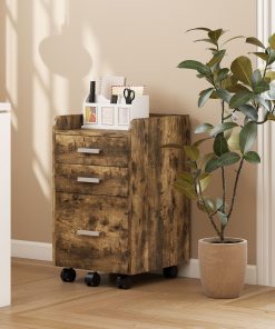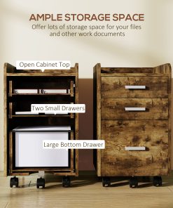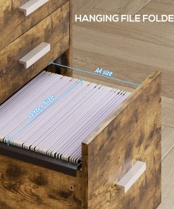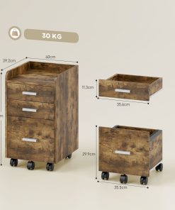 Keep workspace files tidy with this wood-effect filing cabinet. It has three drawers to hold papers, boxes, files and stationery. A compact size which slots under desks easily, it is complete with five wheels to move around easily – please two brakes for security. Robust MDF and particle board ensure durability for the file cabinet.