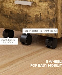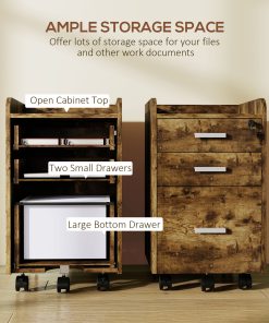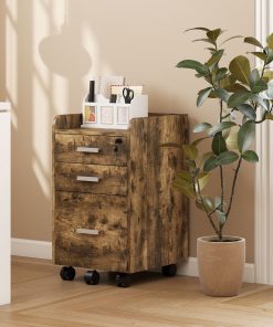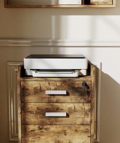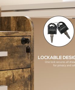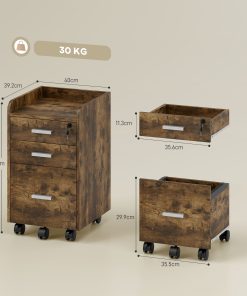 Keep workspace files tidy and secure with this wood-effect lockable filing cabinet. It has three drawers to hold papers, boxes, files and stationery, with a lockable top drawer for security. A compact size which slots under desks easily, it is complete with five wheels to move around easily – please two brakes for security.