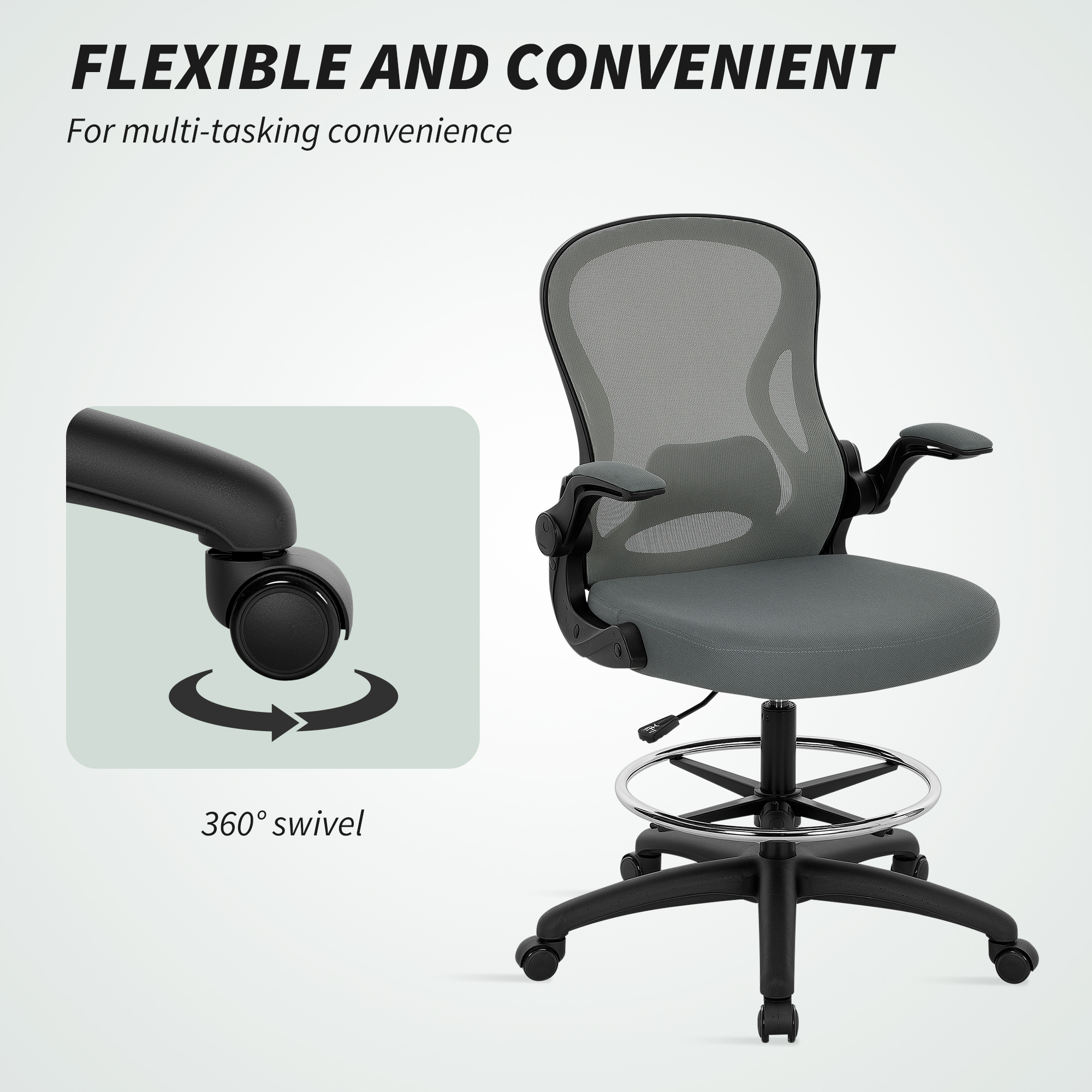 This mesh office chair, from Vinseto, comes in a draughtsman design – great for working at higher levels. Adjust the height between 52-72cm easily, thanks to the under-seat lever. The padded seat, curved mesh back, flip-up arms and five-wheeled base make it a pleasure to sit on and use, supporting you as you work. Adjust the bottom bar to rest your lower body comfortably. Tall surfaces? No problem!