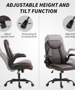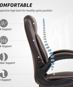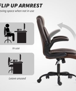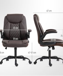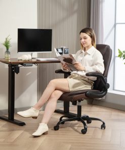 All-day working made comfortable with this home office chair. It’s filled with high-density sponge for comfort, wrapped in faux leather upholstery for a sleek look. It’s fitted with flip-up armrests so the chair can fit easily under your desk when not being used. Complete with wheels to move around empty, both empty or seated.
