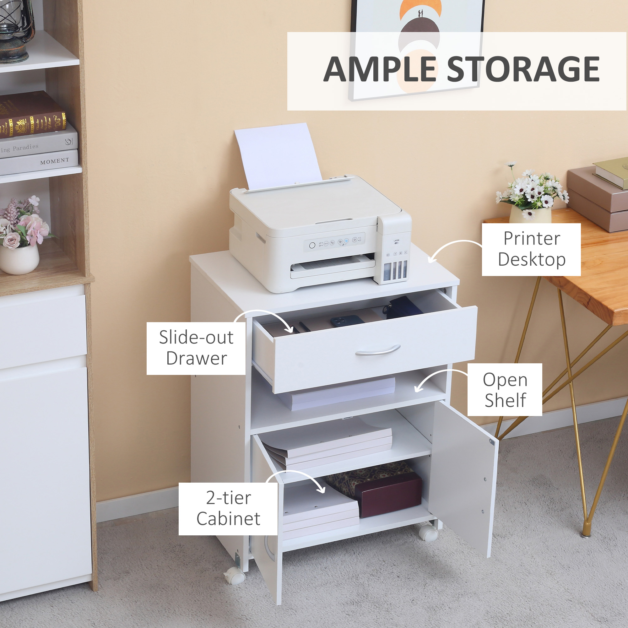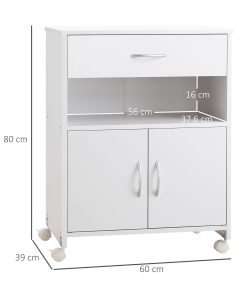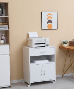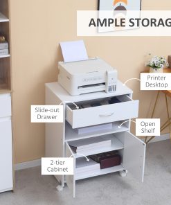 Printer Stand Mobile Printer Cabinet with Storage, Open Shelf, Drawer for Home Office, 60cm x 39cm x 80cm, White